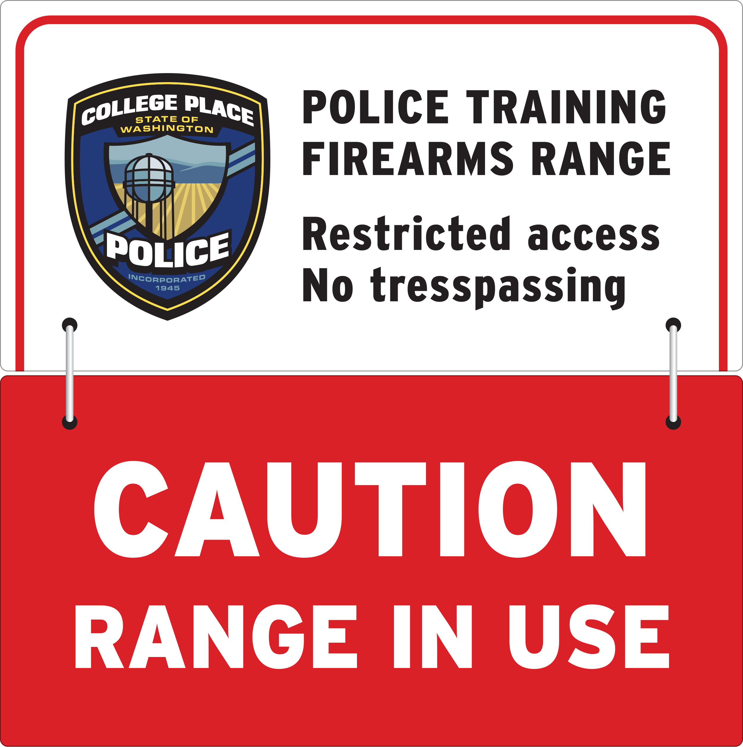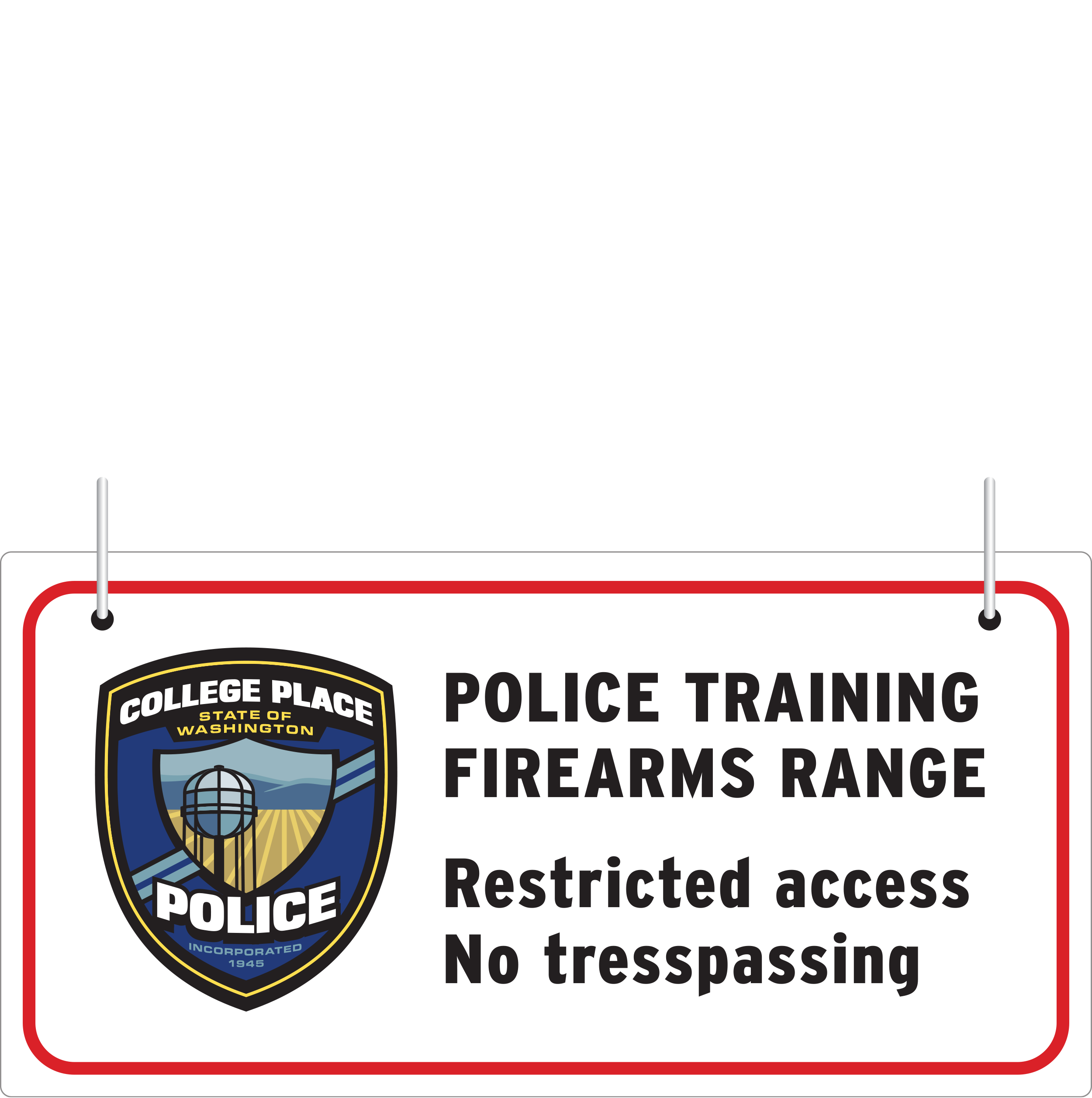College Place Police Range Safety Sign24 × 24 inches, Flips Down View fullsize OPEN CLOSED PatchDesign recreation and cleanup View fullsize View fullsize EMBROIDERED View fullsize BLACK & WHITE (FAX) View fullsize SOURCE CONCEPT