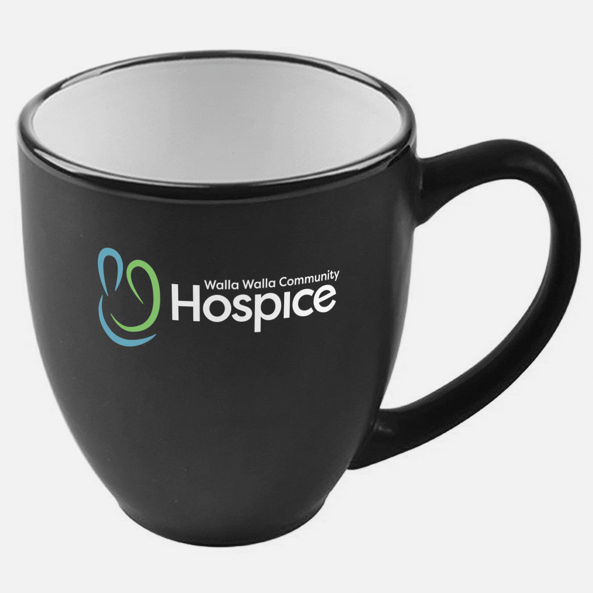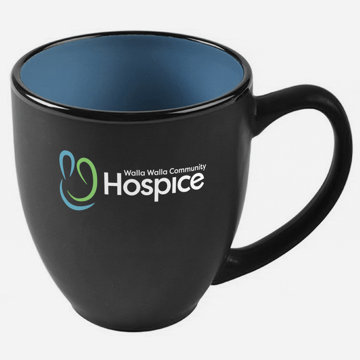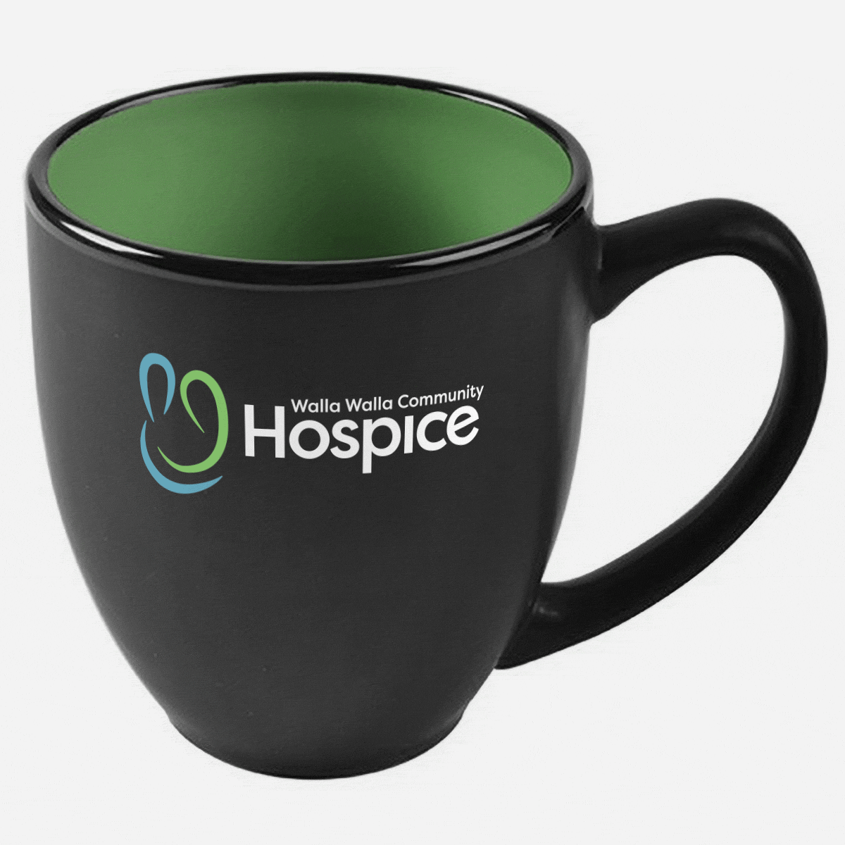 15 oz. two-tone ceramic matte-finish bistro mug. 3-color logo, Blue, green, and white inside.
